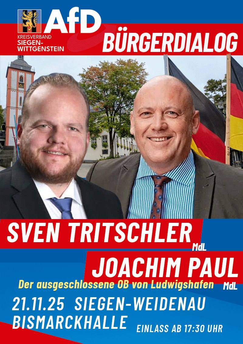 Als Dankeschön an unsere treuen Wähler und Unterstützer in Wittgenstein, findet die Veranstaltung in Bad Laasphe im Haus des Gastes statt. Einlass ist ab 18 Uhr, Beginn etwa 18:30 Uhr. Wir würden uns freuen, Sie begrüßen zu können.
